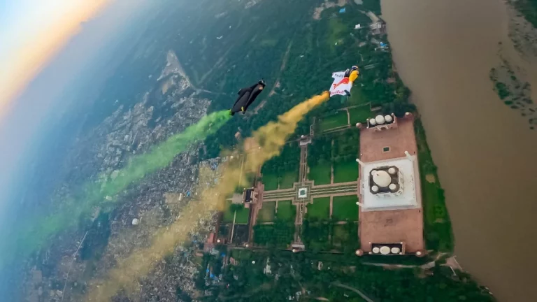 পাখির চোখে দেখা গেলো বিশ্ব ঐতিহ্য তাজমহল। ফ্রেদেরিক ফুগেনের নেতৃত্বে ৩ রোমাঞ্চপ্রিয় উইংস্যুট পরে উড়লেন আগ্রার আকাশে।